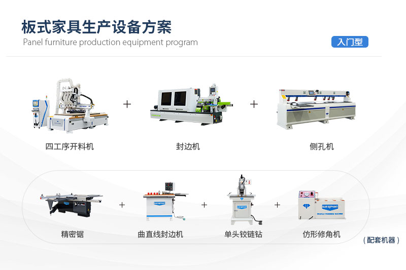 ?入門型-板式家具生產(chǎn)設(shè)備方案柜體生產(chǎn)解決方案主要由四工序開料機(jī)、封邊機(jī),鋸片側(cè)孔機(jī)、精密鋸、曲直線封邊機(jī)、單頭鉸鏈鉆孔機(jī)、倒角機(jī)七種設(shè)備組成,可用于加工生產(chǎn)板式家具、櫥柜、衣柜、板式家具、兒童家具等柜體的制造加工。